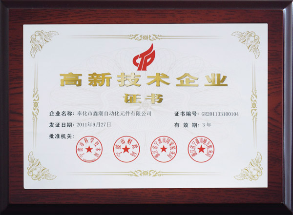 鑫潮氣動公司 被寧波多家政府機關(guān) 授予“國家高新技術(shù)企業(yè)”稱號。